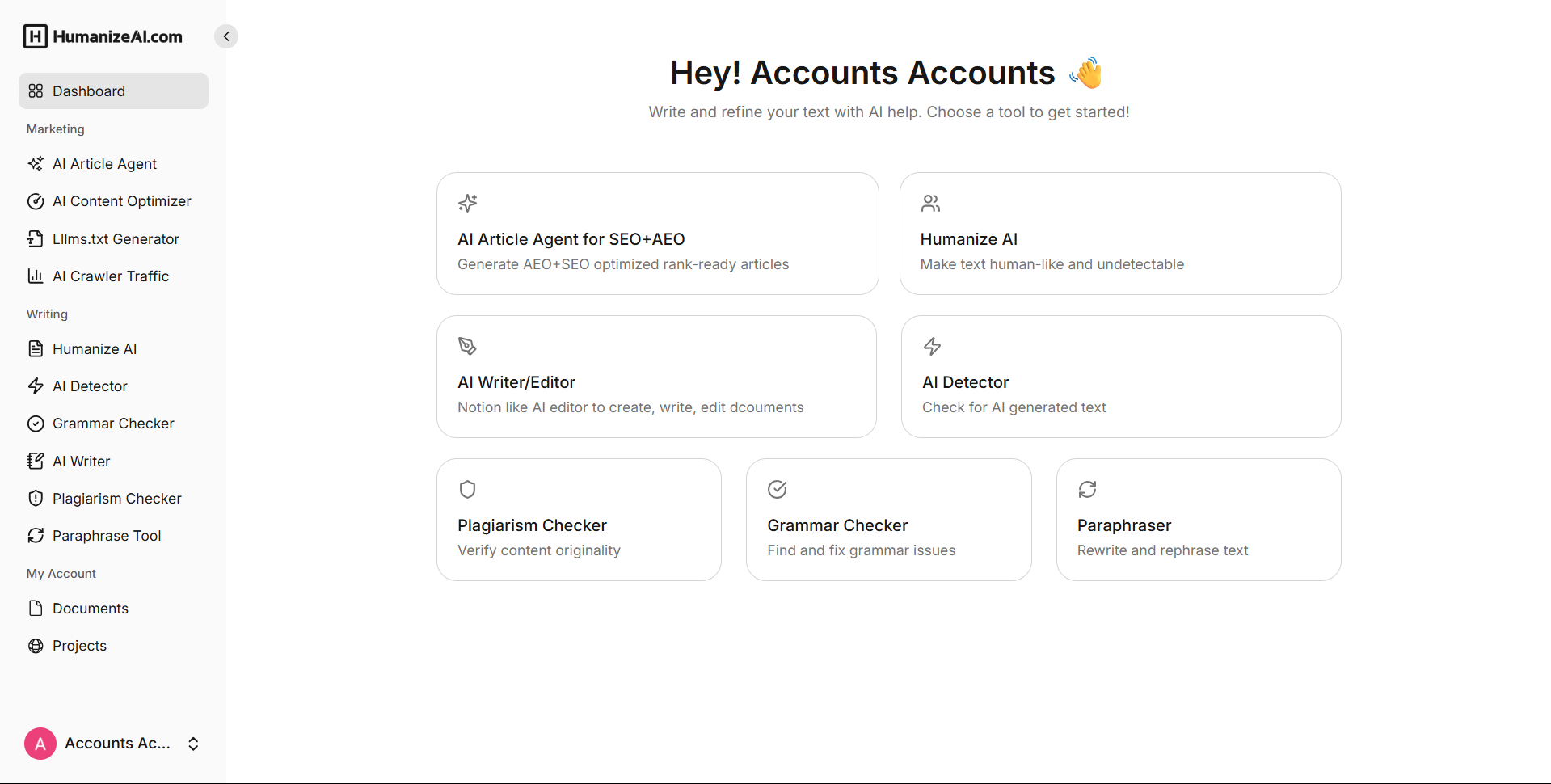 Whether you're a content marketer aiming for top search results or a student ensuring your writing bypasses AI detectors, HumanizeAI empowers you to create authentic content that performs and connects—saving you a lot of time with our complete suite of writing tools.